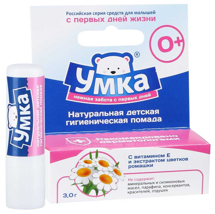 Хорошее средство, защищающее детские губы, на основе натуральных масел и восков от бренда Умка. Лечебная помада рекомендована для ежедневного использования как детьми, так и взрослыми. Она не вызывает раздражения и быстро справляется с трещинками и шелушением. Имеет следующие преимущества: