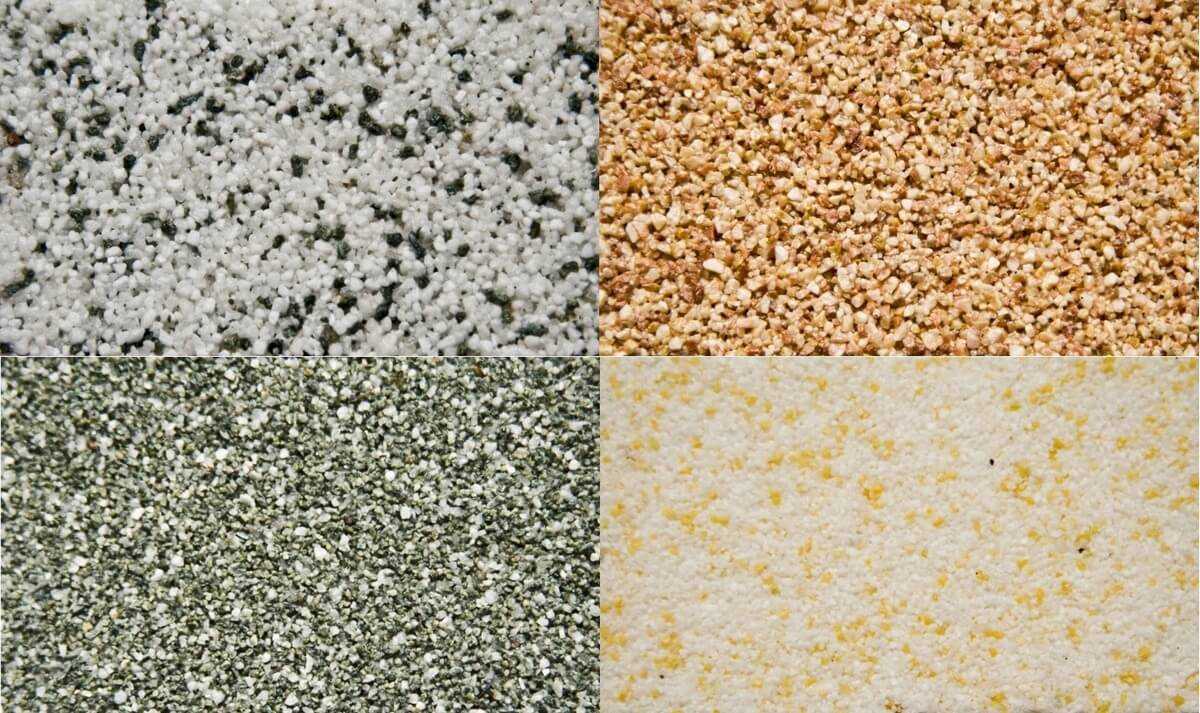- Микроминерал. Смесь на основе окрашенной шорообразной мраморной крошки. Имеет 24 цветовых решения и мелкую фактуру. Для ручного и машинного нанесения.