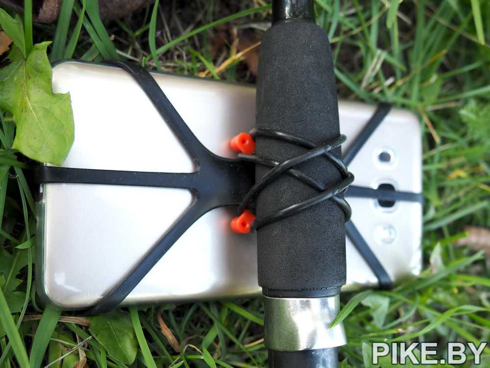 Крепление на удилище. Можно также использовать для крепления телефона к рулю велосипеда. Вначале показалось хлипким и ненадежным. В зависимости от размера телефона и силы заброса, поначалу было страшновато, что он когда-то оторвется. Со временем понял, что это скорее вопрос навыка и привычки. Теперь бросаю только с прикрепленным телефоном. Во время заброса придерживаю его пальцем — все удобно работает.