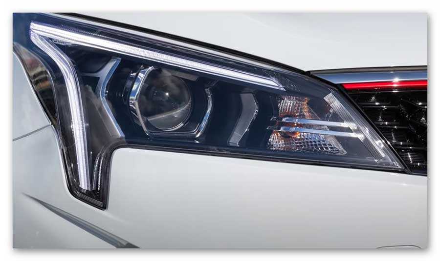 - «роскосые», почти треугольные передние фары, предлагаемые в топе с двумя линейками светодиодов в виде линий V;