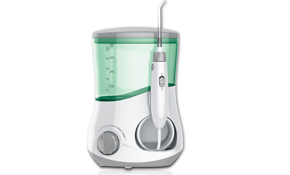 Этот ирригатор относят к полноценным зубным центрам, он идеален для струйной очистки зубов в домашних условиях. Прибор дополнительно оснащен электрической зубной щеткой с таймером, работающей в 5-ти режимах, и укомплектован 9-ю насадками: классические, для языка, ортодонтических конструкций. Ирригатор не только быстро очищается полость рта и межзубные промежутки, он бережно убирает налет с эмали, массирует десна. Резервуар легко снимать и мыть, он вмещает 600 мл жидкости. Кроме того, можно брать ирригатор в путешествия и поездки – для этого в комплекте идет сумка для транспортировки.