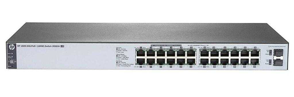 - HP 1820-24G – 16-портовый девайс с минимумом настроек и парой разъёмов для оптического волокна. Уникален пожизненной гарантией и активным управлением мощностью для экономии электроэнергии. При перегрузках приоритет предоставляет трафику с видео и VoIP.