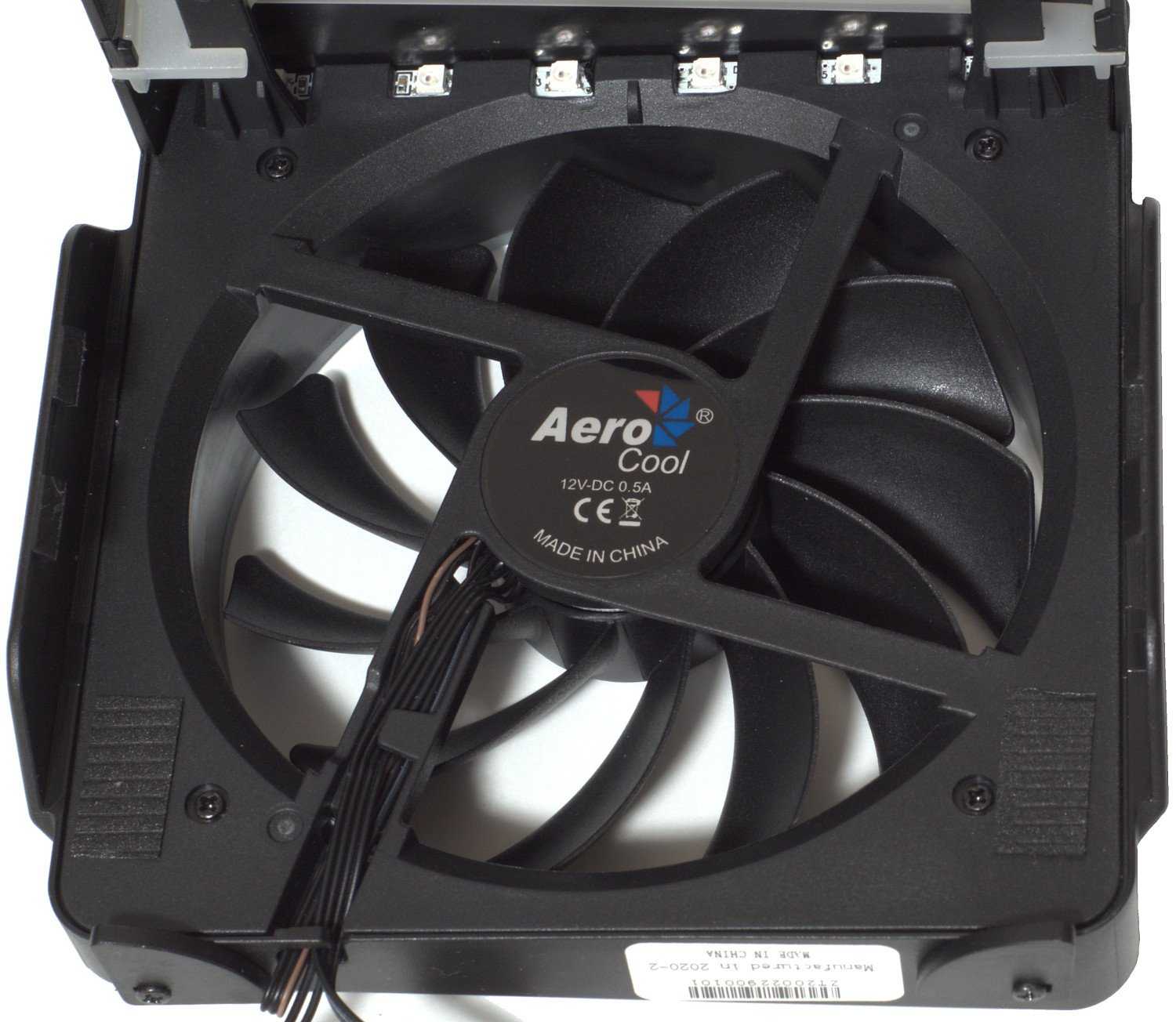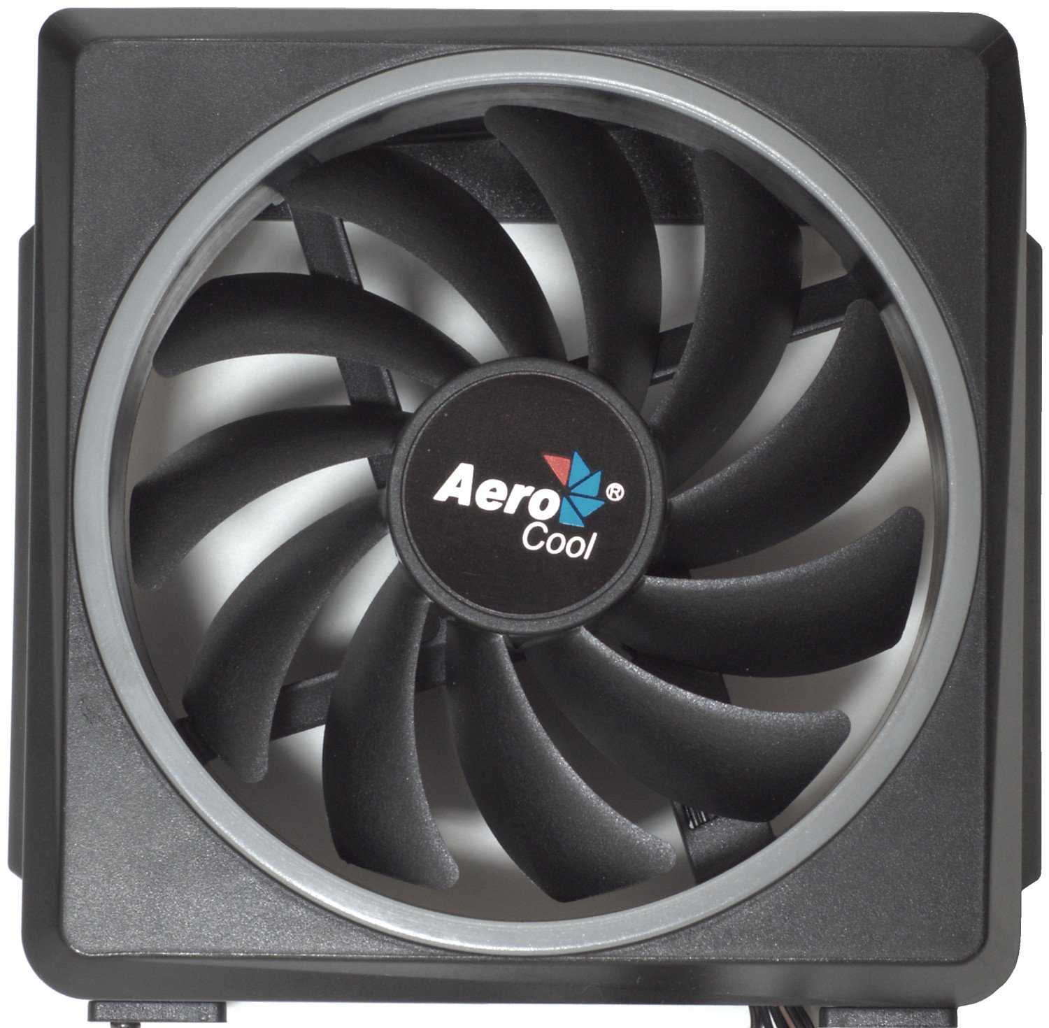 За обдув отвечает 120 мм Aerocool с максимальными паспортными оборотами 1800 rpm, закрепленный в кожухе. Особенность – на корпусе размещены ARGB-светодиоды .