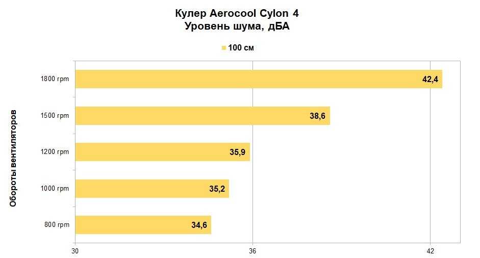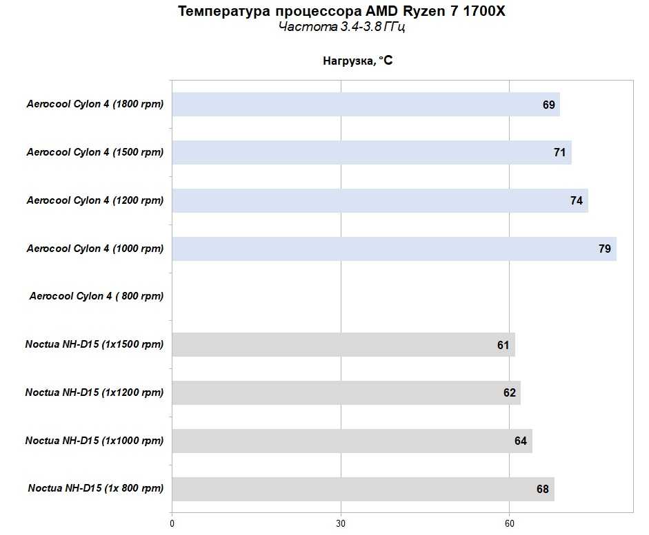 Как ранее отмечали, из-за своих размеров и 4-х тепловых трубок неплохую эффективность кулер Aerocool Cylon 4 демонстрирует при средних-высоких оборотах вентилятора (от 1200 rpm). А вот при 800 rpm кулер с охлаждением не справился, но тут стоит сказать, что тестирование проходило при повышенной температуре внешней среды (26,8 °С_, а это дополнительная «нагрузка» на кулер.