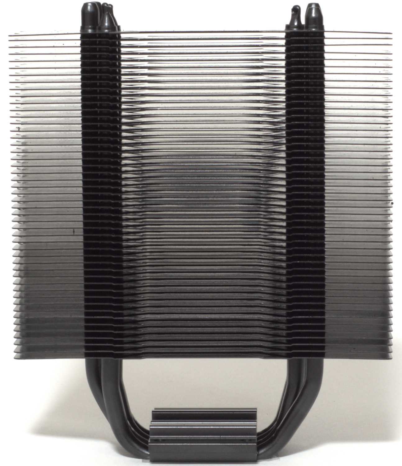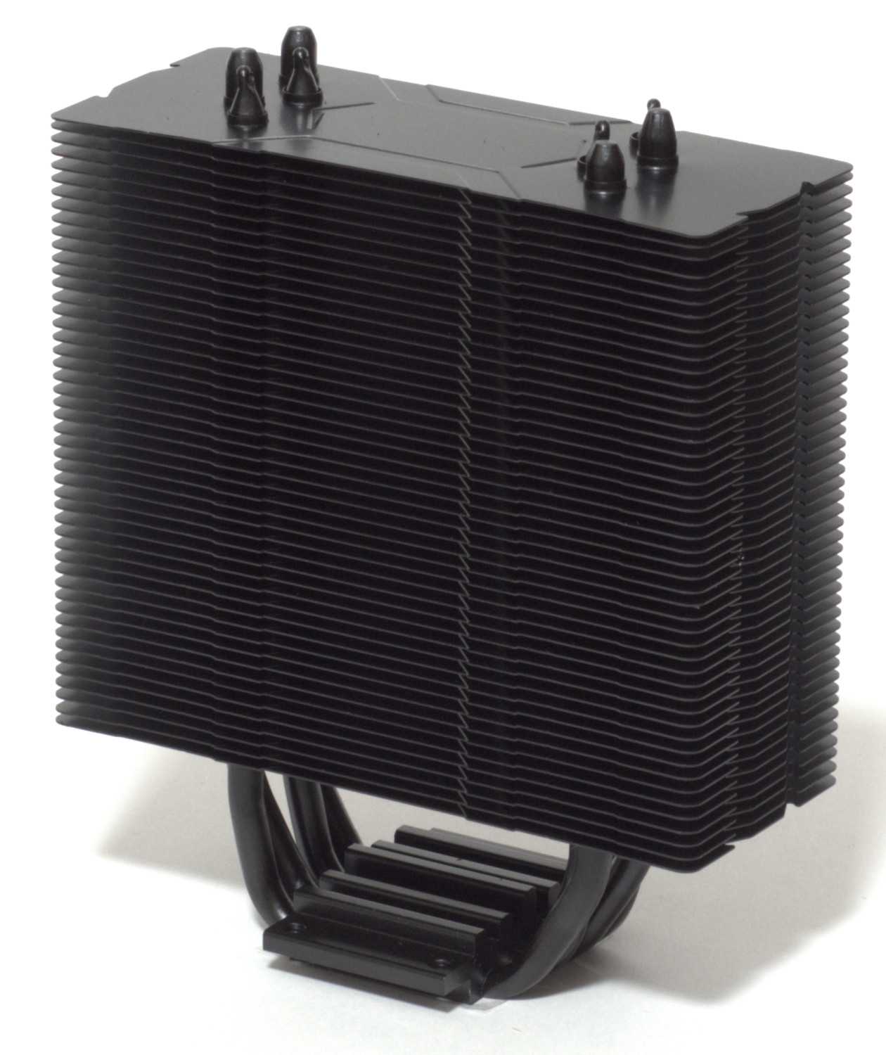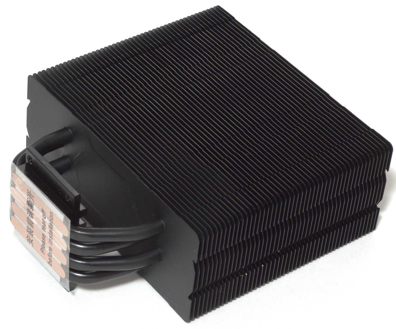 С точки зрения конструкции, то тут все стандартно: четыре U-образные медные тепловые трубки и алюминиевые пластины. Эффект дороговизны и солидности производит полностью черная окраска радиатора.