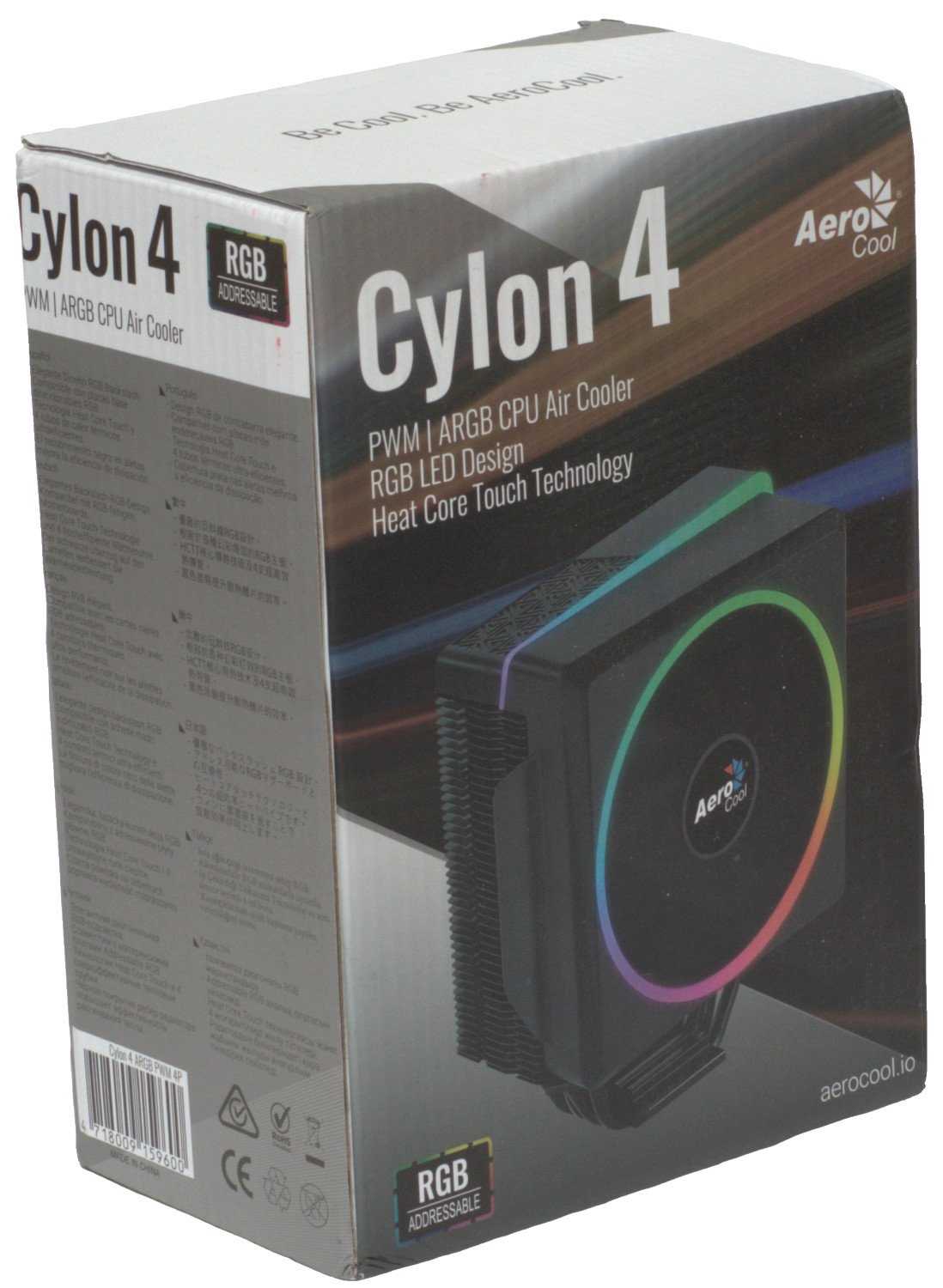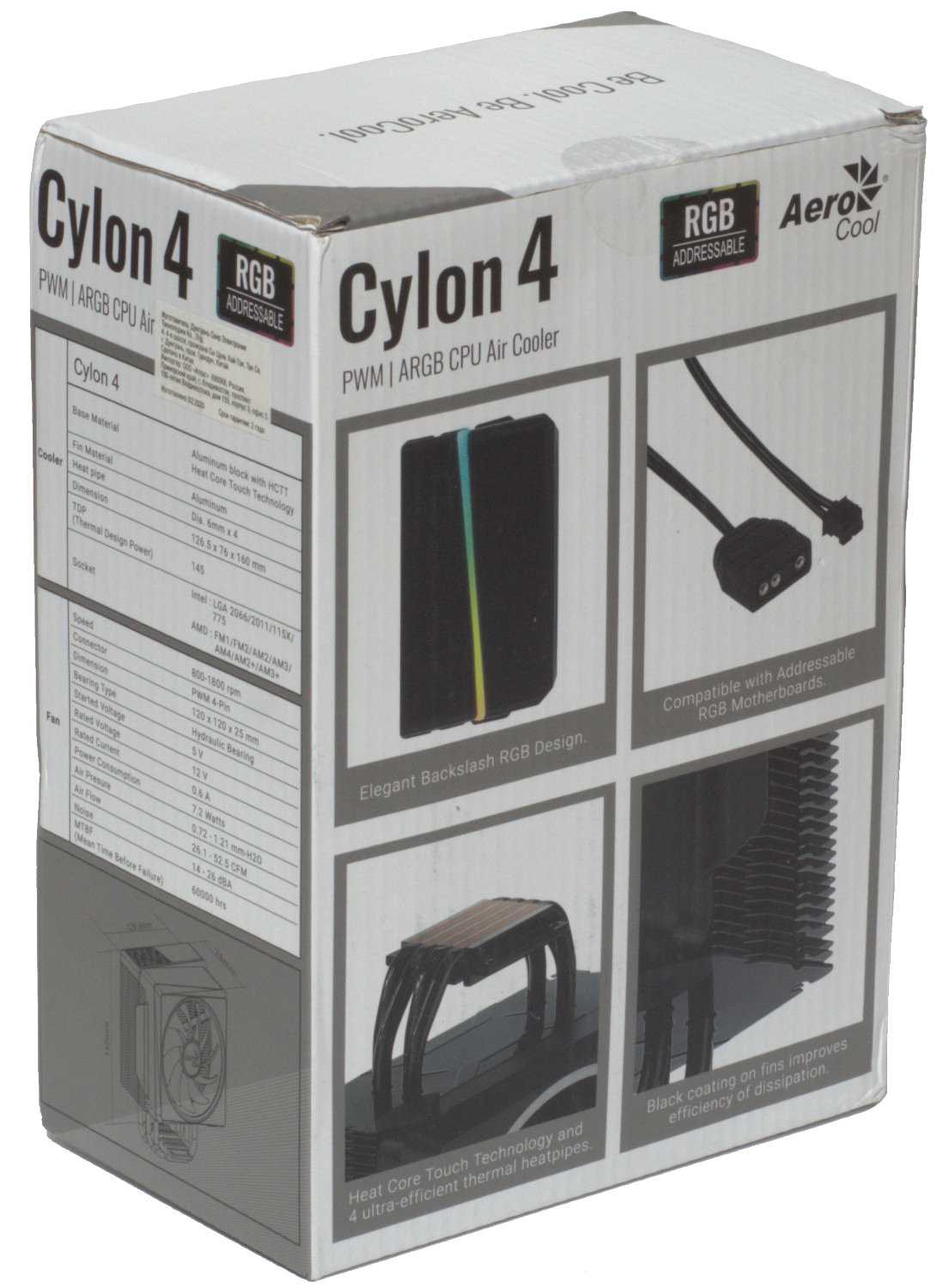 Простой стиль оформления упаковки кулера Aerocool Cylon 4 по-прежнему остался, но коробка получилась весьма информативной, позволяющей оценить особенности кулера в виде наличия ARGB-подсветки с возможностью управления ею через материнскую плату, черного радиатора и 4-х медных тепловых трубок с технологией прямого контакта HCTT для лучшего теплоотвода.