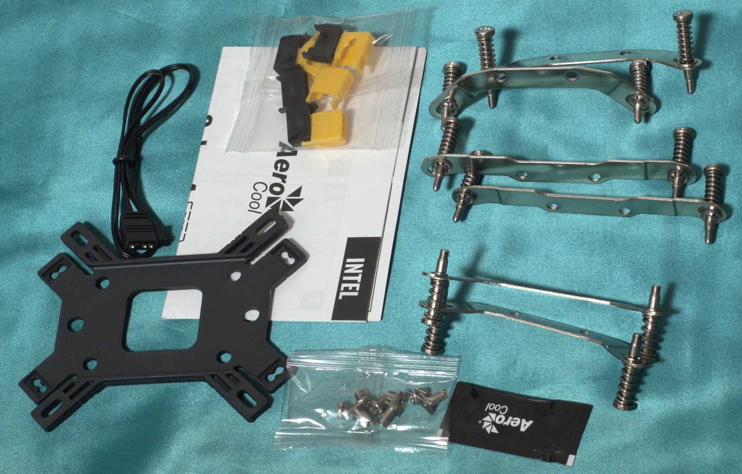 Набор аксессуаров позволяет установить кулер на платформу Intel LGA775/115x/2011(-3)/2066 или AMD AMx(+)/FMx(+) с использованием универсального бекплейта и обеспечить синхронизацию ARGB-подсветки с материнской платой. Имеется также небольшой пакетик с термопастой и руководство пользователя.