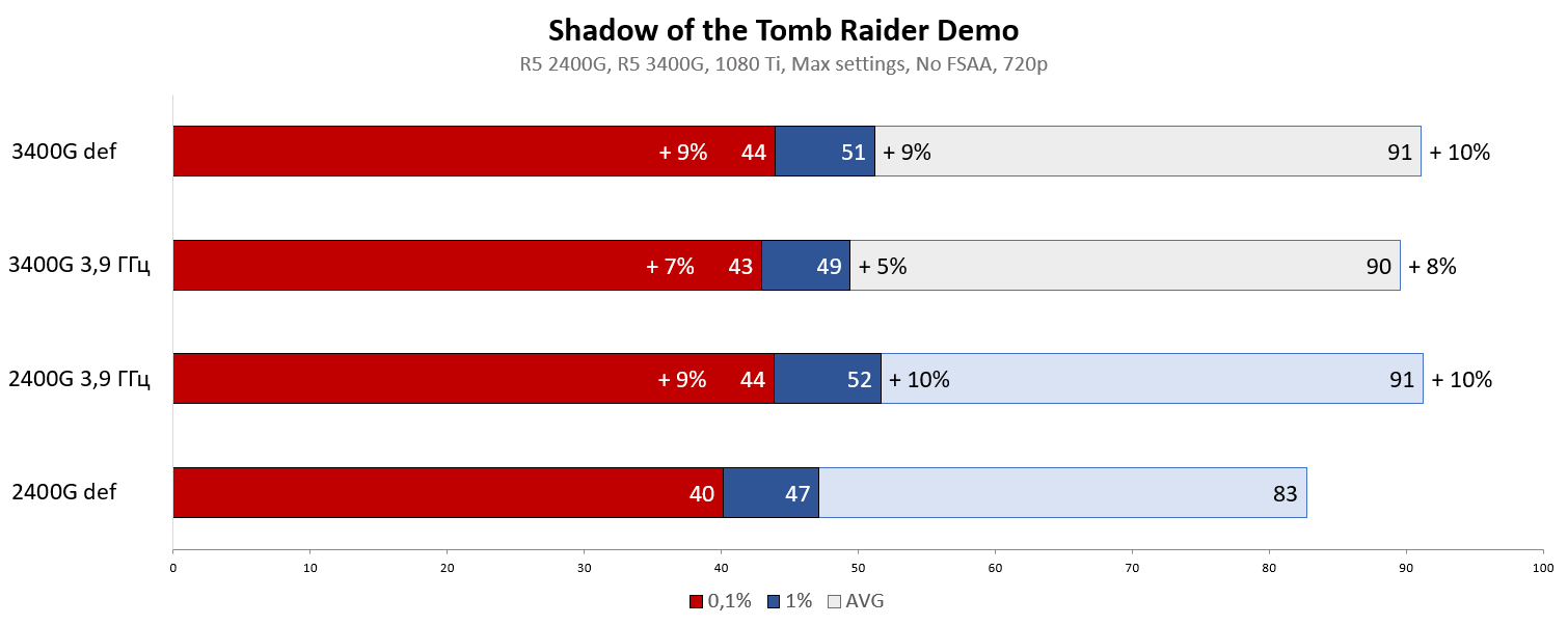 Очень комфортные значения фпс, ощутимую разницу от режима использования получает только 2400G, разгон до 3900 МГц позволяет сравняться с 3400G.