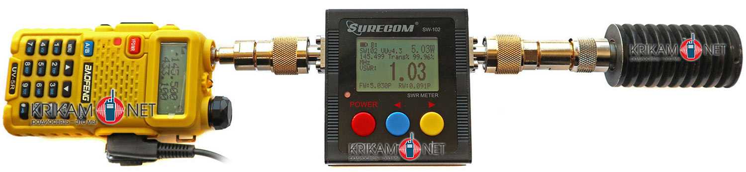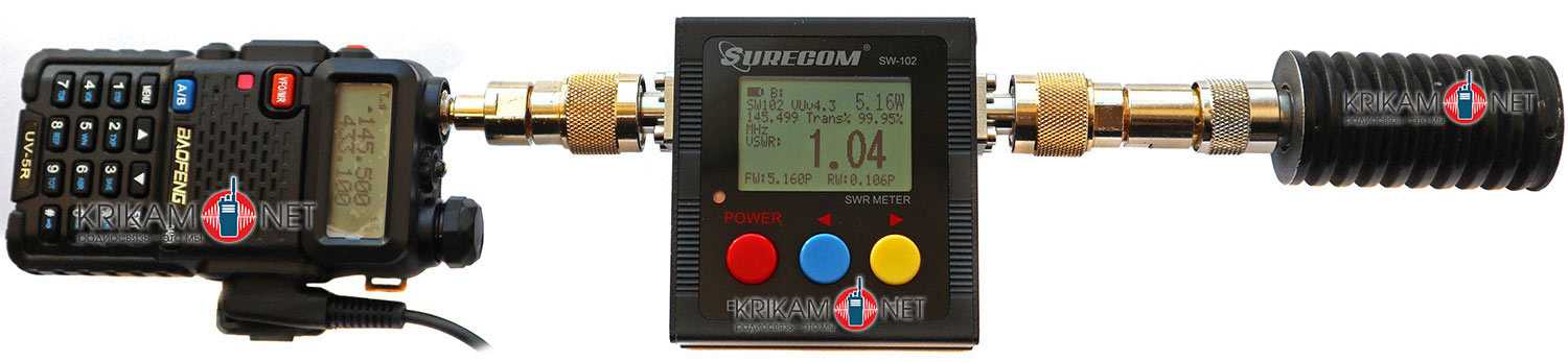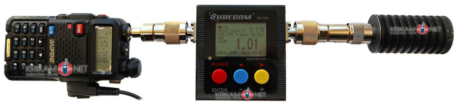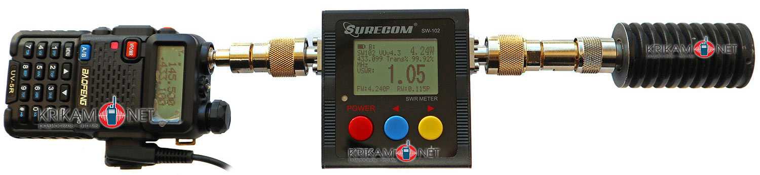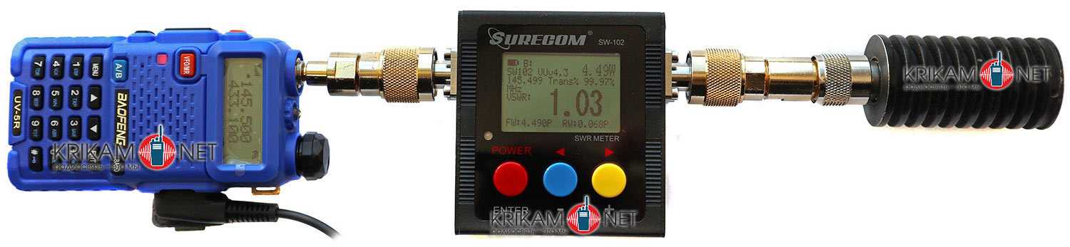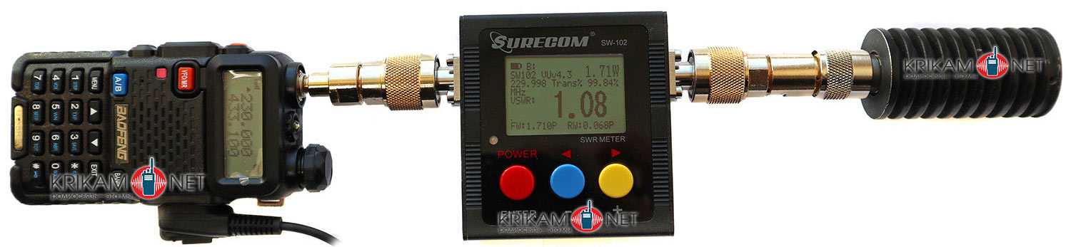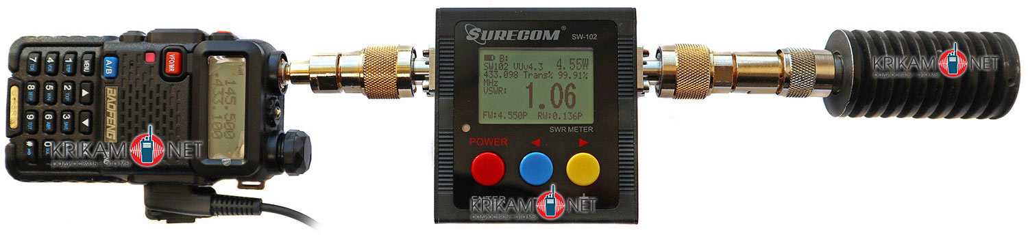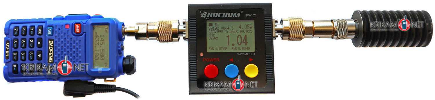 Для замера будем использовать прибор Surecom SW-102, согласованную нагрузку Diamond DL-50, набор переходников и гарнитуру для активации режима передачи вместо использования кнопки PTT. Аккумуляторные батареи всех радиостанций полностью заряжены, приступаем к замерам, фиксируя их на фото.