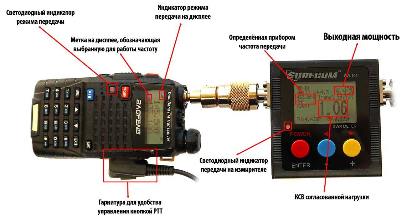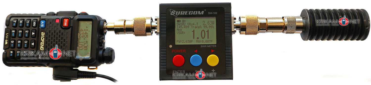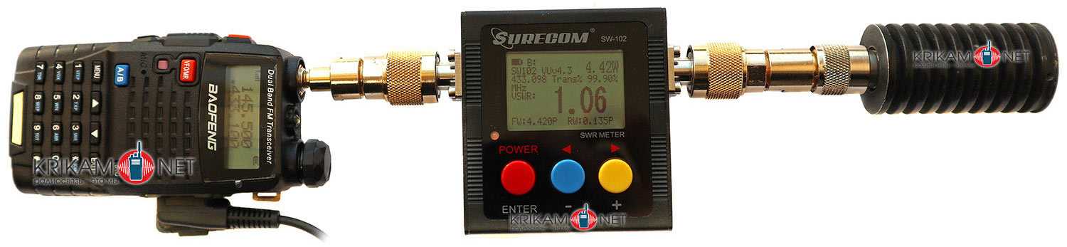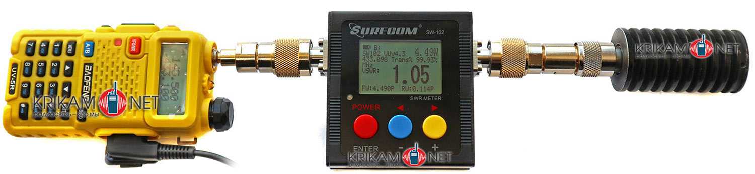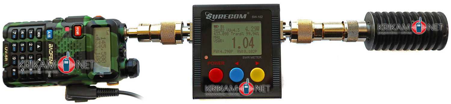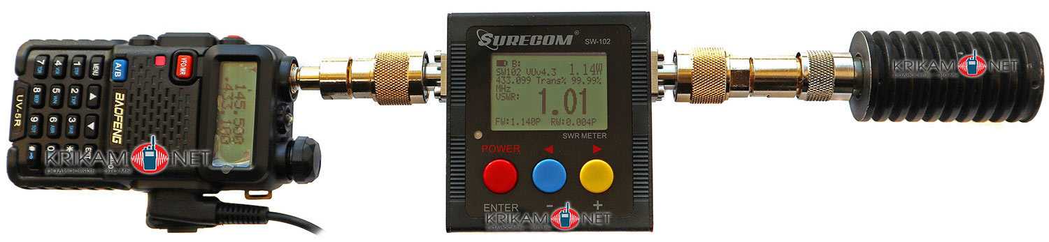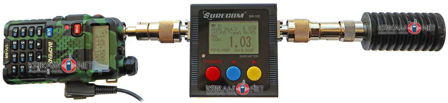 Для замера будем использовать прибор Surecom SW-102, согласованную нагрузку Diamond DL-50, набор переходников и гарнитуру для активации режима передачи вместо использования кнопки PTT. Аккумуляторные батареи всех радиостанций полностью заряжены, приступаем к замерам, фиксируя их на фото.
