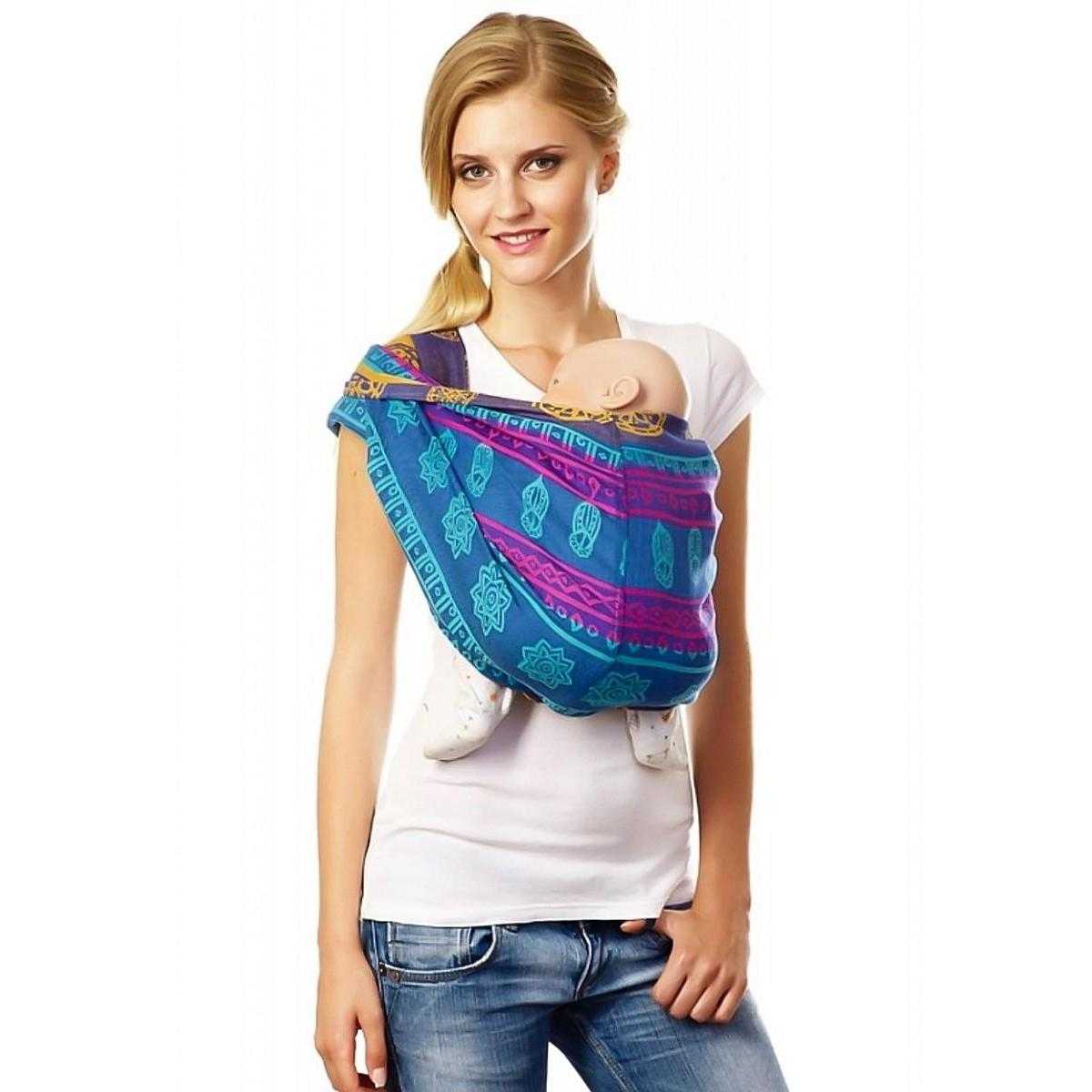 Расцветки варьируются между однотонными карманами и мини-переносками с узорами, орнаментом. Средняя степень рыхлости полотна способствует пропусканию воздуха внутрь, что гарантирует точную терморегуляцию. При этом ткань не совсем тонкая, прохладным вечером малыш не замерзнет. Нагрузка распределяется правильно, поясница и руки мамы находятся в удобном положении, как и сам ребенок.