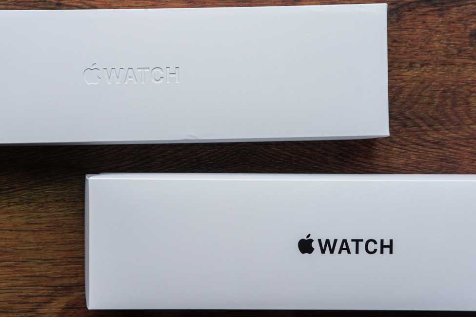 На обложке вместо тисненного логотипа — простая надпись. На коробке с часиками Series 6 — объемное изображение, а с SE — просто напечатанная картинка. Сами Series 6 находятся в картонном чехольчике, а SE запакованы в тонкую полупрозрачную бумагу (что-то вроде кальки для снятия копий с чертежей или рисунков).