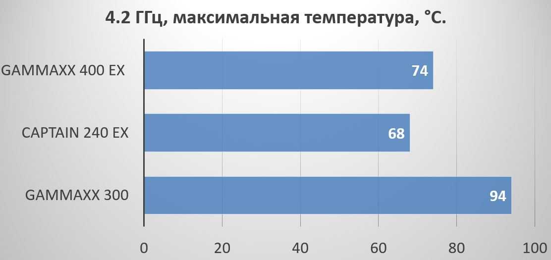 Для сравнения приведем сводную таблицу максимальных температур процессора на частоте 4.2 ГГц на различных системах охлаждения от Deepcool. Бюджетное решение будет представлять Deepcool GAMMAXX 300, высокоэффективным представителем будет система жидкостного охлаждения Deepcool CAPTAIN 240 EX. Вентиляторы работали в режиме Smart mode со значениями по умолчанию, система сама настраивала обороты в зависимости от температуры.
