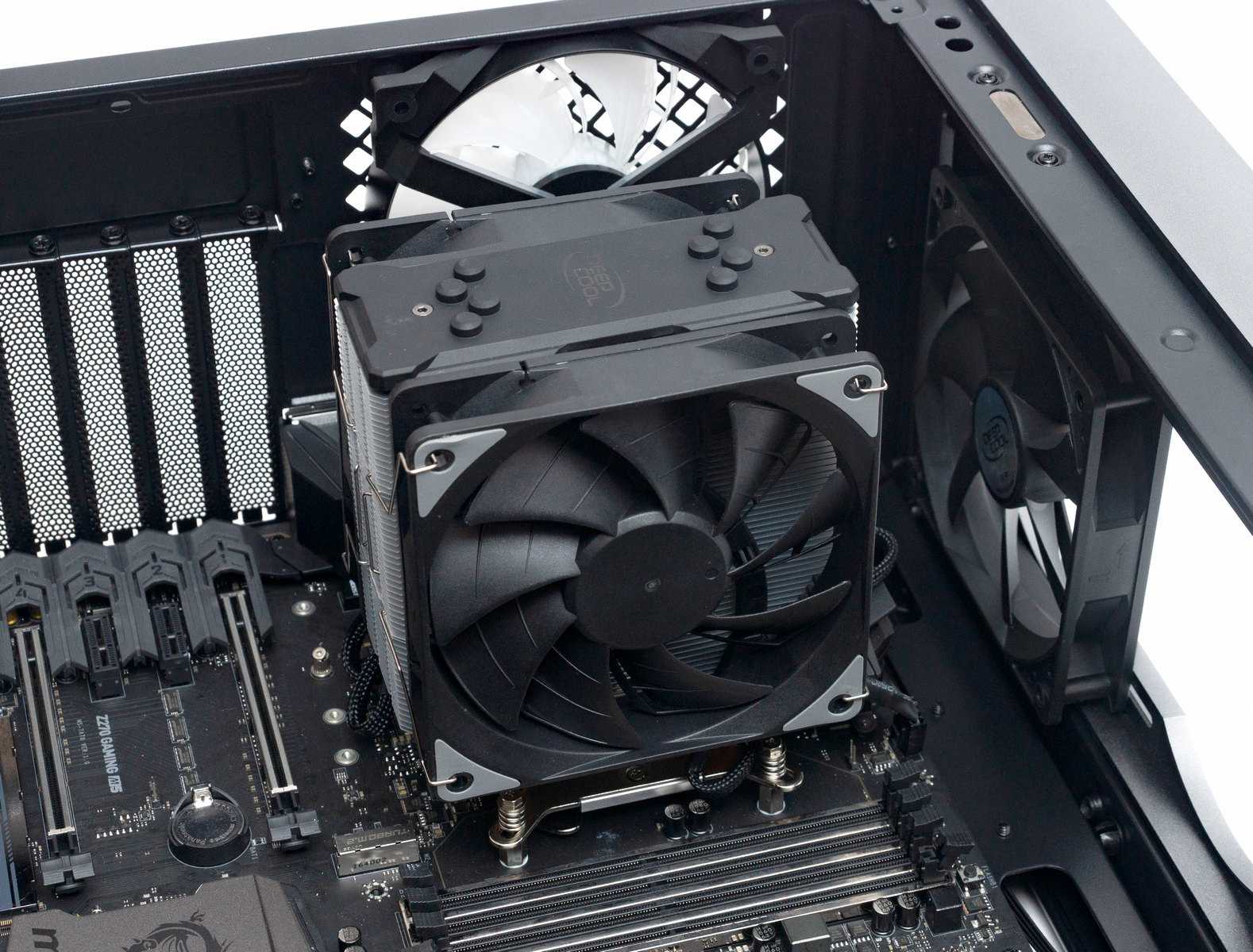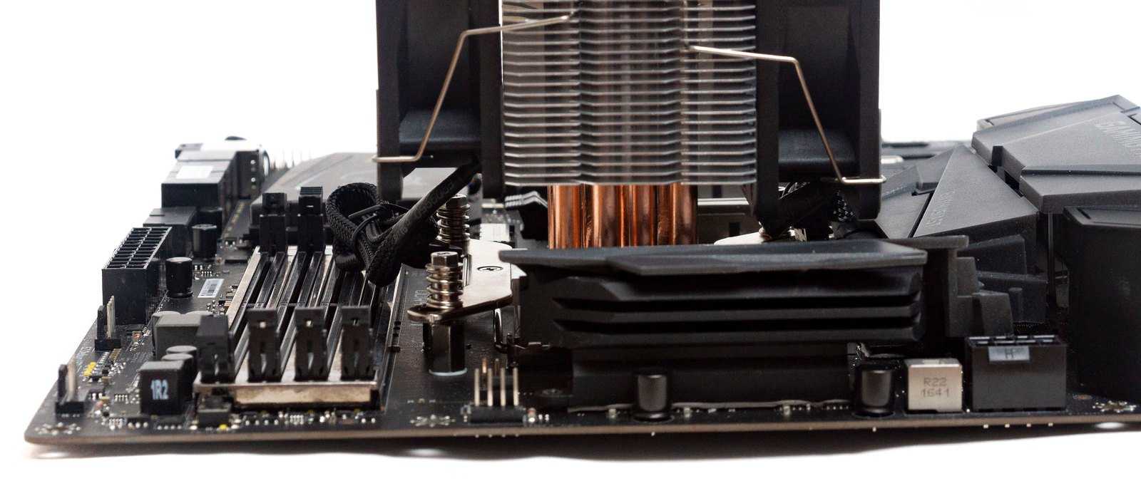 Кулер с вентиляторами на ATX материнской плате не перекрывает слоты оперативной памяти и не мешает установке видеокарты в верхний слот. Его высота — всего 157 мм, что делает кулер совместимым с большинством корпусов.