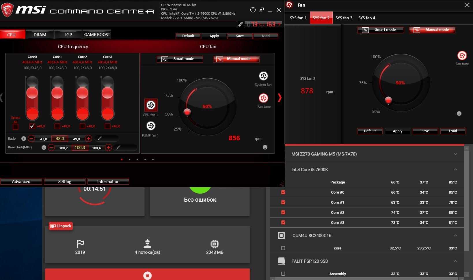 Для тестирования использовалась утилита OCCT v6.0.0, тест Linpack прогонялся до 10 минут. Температура мониторилась по самому горячему ядру. Обороты вентиляторов регулировались утилитой MSI Command Center в ручном режиме, в четырех значениях: 1500, 1200, 860 и 550 об/мин – от максимального до минимального значений работы данных вентиляторов.