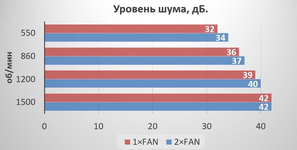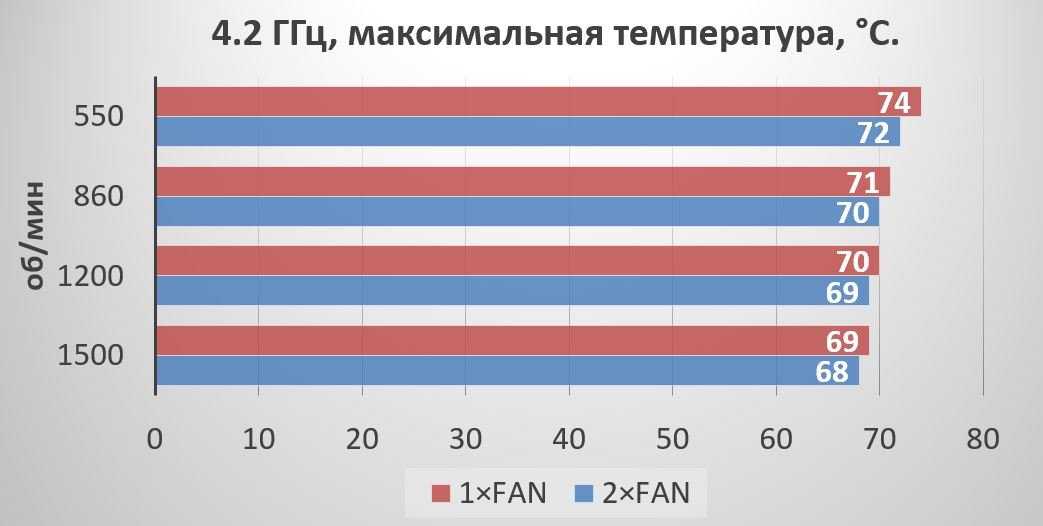 С охлаждением тестового процессора без разгона кулер справляется легко даже на минимальных оборотах одного вентилятора, в таких условиях второй вентилятор не дает значительной прибавки эффективности. Разница между минимальной и максимальной температурой составила всего 6 градусов. Кулер можно эксплуатировать с одним вентилятором на минимальных оборотах.