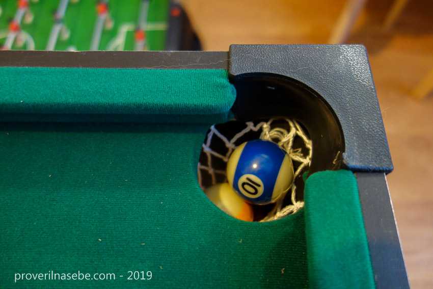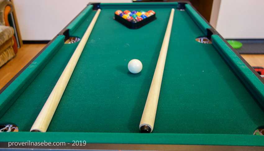 Такой вариант рассчитан на квартиры и небольшие дома, также его можно брать с собой на дачу из-за небольшого веса – 56 кг и размера 6 футов. При необходимости, оборудование можно спрятать благодаря складным ножкам. По функциональным возможностям оно практически не уступает большим столам, но при этом стоит как минимум в 10 раз дешевле. Данная модель предназначена для игры в американский пул.