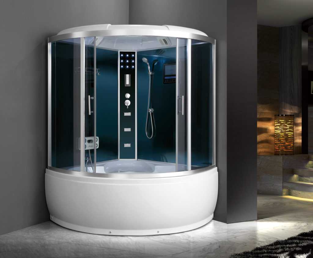 Относится к классическому типу с поддоном в виде одной четвертой круга, имеется полностенное ограждение. Кроме стандартного набора производители предоставляют 3 форсунки с функцией массажа, лейку для тропического душа и принудительную вентиляцию.