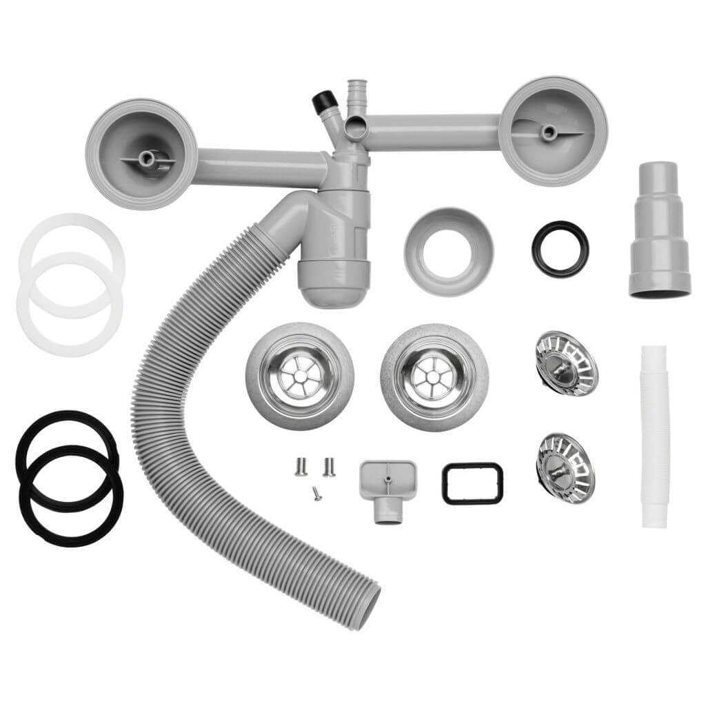 Раковины на 2 секции предполагают использование одного сифона, но нестандартной конструкции. У такого изделия будет 2 выпуска, которые соединяются одним сифоном. Он бывает трубчатым и в виде колбы. Дополнительно есть модели с отводами для подключения стиральных машин и другой техники.