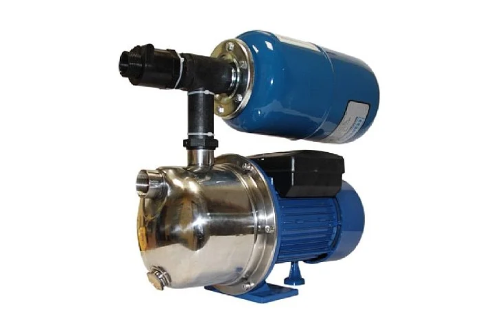 Небольшая насосная станция с электродвигателем мощностью 850 Вт, центробежным насосом и корпусом из нержавеющей стали.