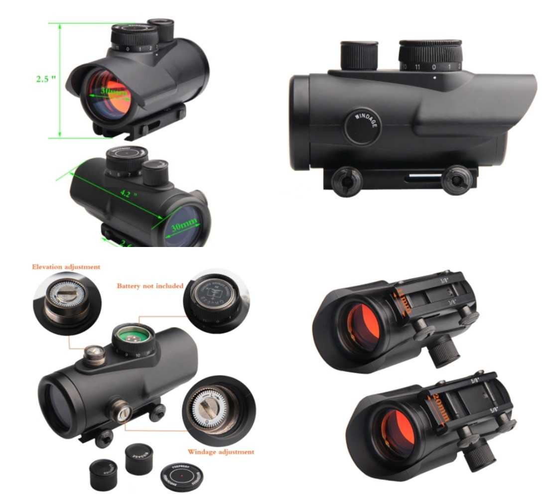 Недорогой прицел. Неплохие технические параметры сочетаются с низкой ценой. Конструкция оснащена четырьмя прицельными метками. Это: кружочки, крестики, точки красного и зелёного цвета. Корпус герметичный, можно использовать во время осадков. Габариты: 5,4х7,9х2,9 см.