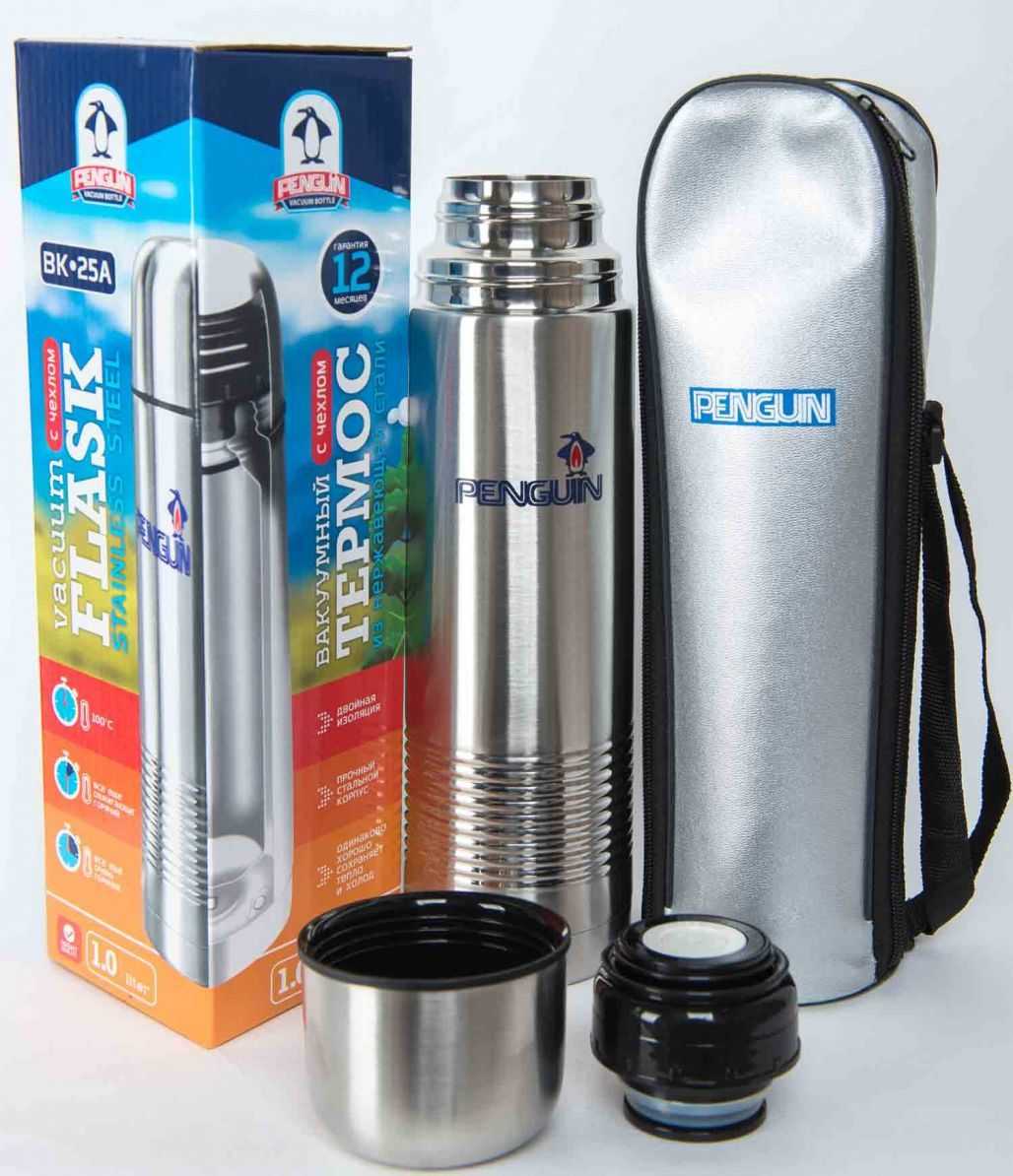 | Penguin ВК-25А | 1000 | 24 часа | в комплекте винтовая пробка с клапаном, открывающим небольшое отверстие, крышка-чашка и чехол с ручкой-ремнем. |