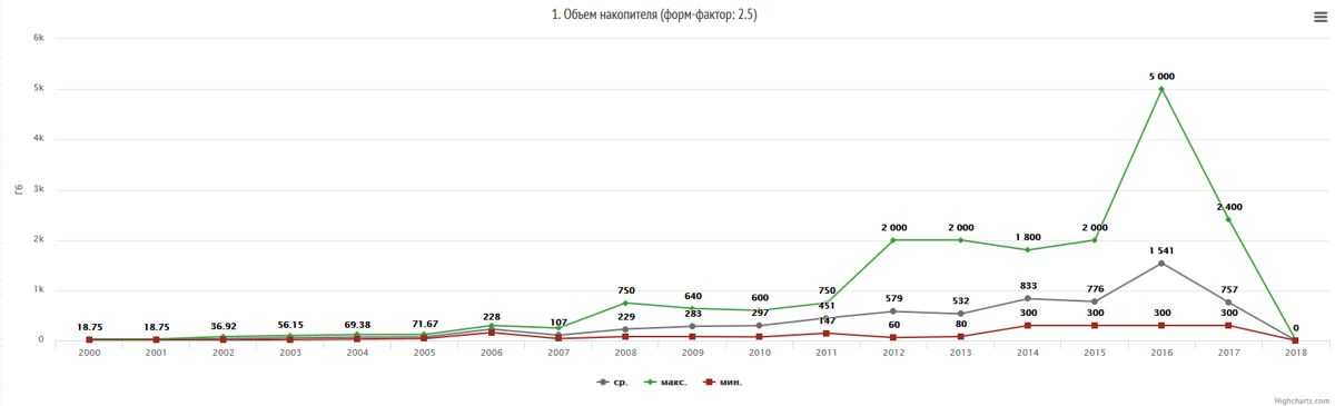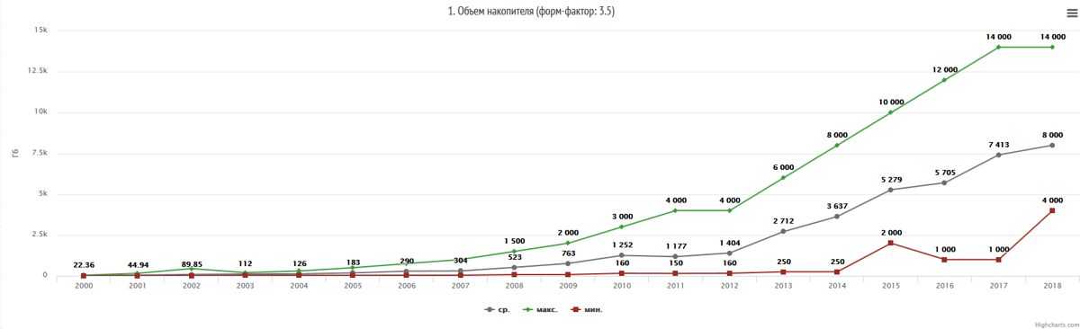 Прошлое. С 2000 г. по 2010 г. емкость жестких дисков выросла в с 41 Гб до 3000 Гб – в 73 раза. С 2010 г. по 2018 г. емкость жестких дисков выросла с 3 Тб до 14 Тб — в 4,6 раз. Маловероятно, что за следующие два года темпы прироста объема жесткого диска догонят тот впечатляющий показатель за предыдущую декаду, но тенденция к уверенному росту сохраняется.