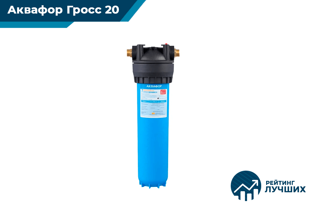 Предфильтр встраивается в магистральный трубопровод. Его максимальная пропускная способность до 76 л/мин. В трубопроводе давление может достигать 6,2 атмосферы. Габариты Аквафор Гросс 20 составляют 23,5×60,6×18 см, масса 3,3 кг.