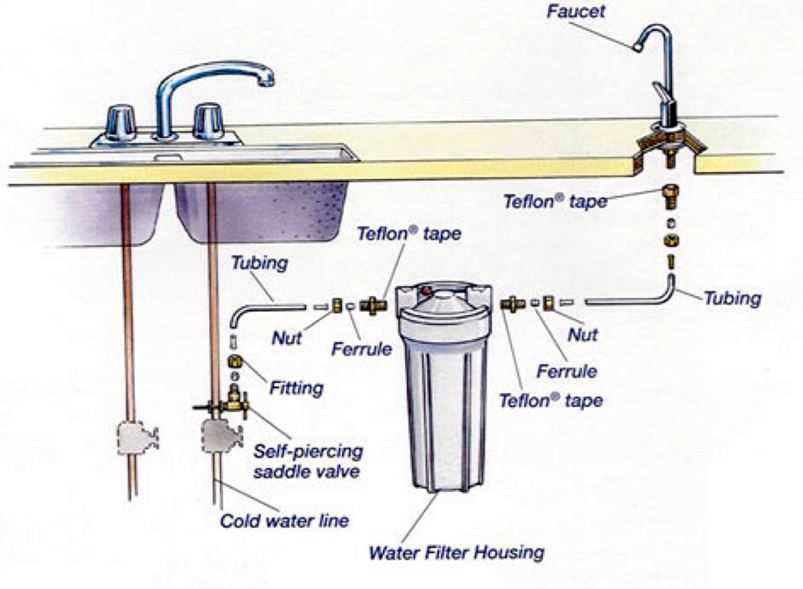 - Размещает проточную ионообменную или накопительную сорбционную систему под мойку для получения питьевой воды;