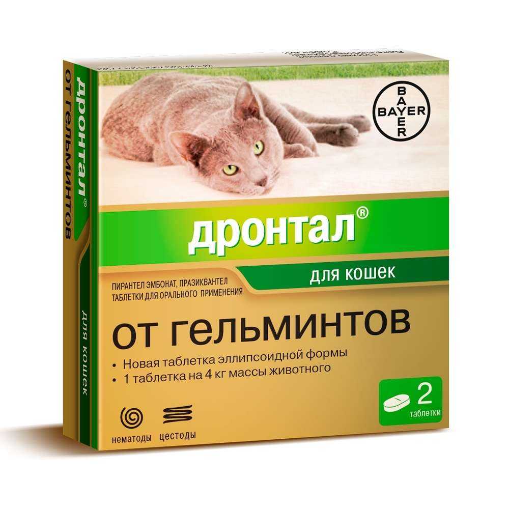 По отзывам владельцев, это немецкое средство от глистов для кошек является одним из самых эффективных. Оно работает против ленточных и круглых гельминтов, при этом не вызывает побочных действий, отлично переносится кошками. Применять Дронтал можно только с 3-месячного возраста, для совсем маленьких котят это слишком сильный препарат. Одна таблетка рассчитана на 4 кг веса животного, дается в утреннее кормление вместе с пищей.