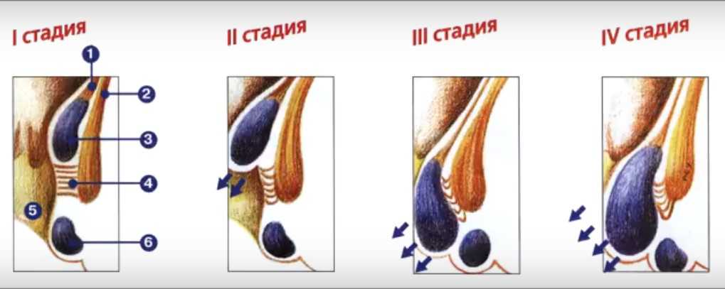 Развитие заболевания происходит постепенно, с чередованием периодов обострения и снижения или даже временного исчезновения симптомов, занимая от нескольких месяцев до нескольких лет.